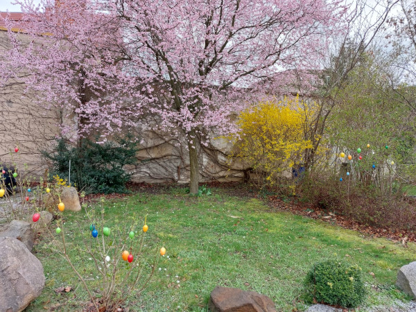 Grüße von Vroni, Martina, Michael, JohannaÜberraschung im Garten Unterm Baum im grünen Grase sitzt ein großer Schmunzelhase!